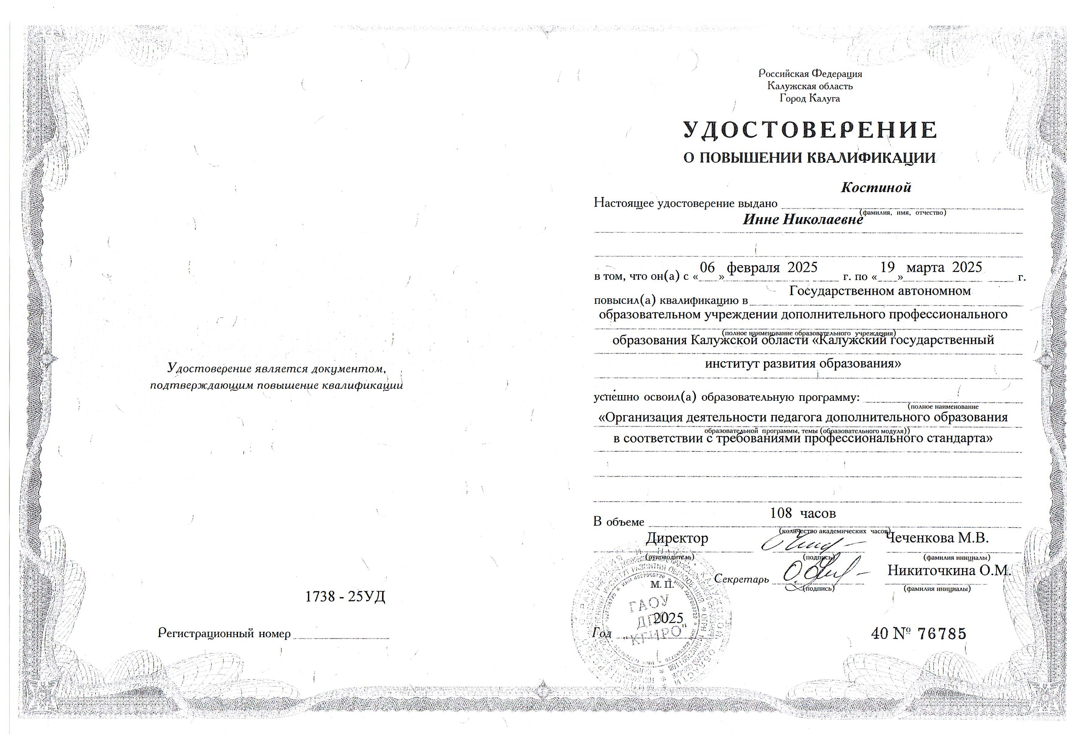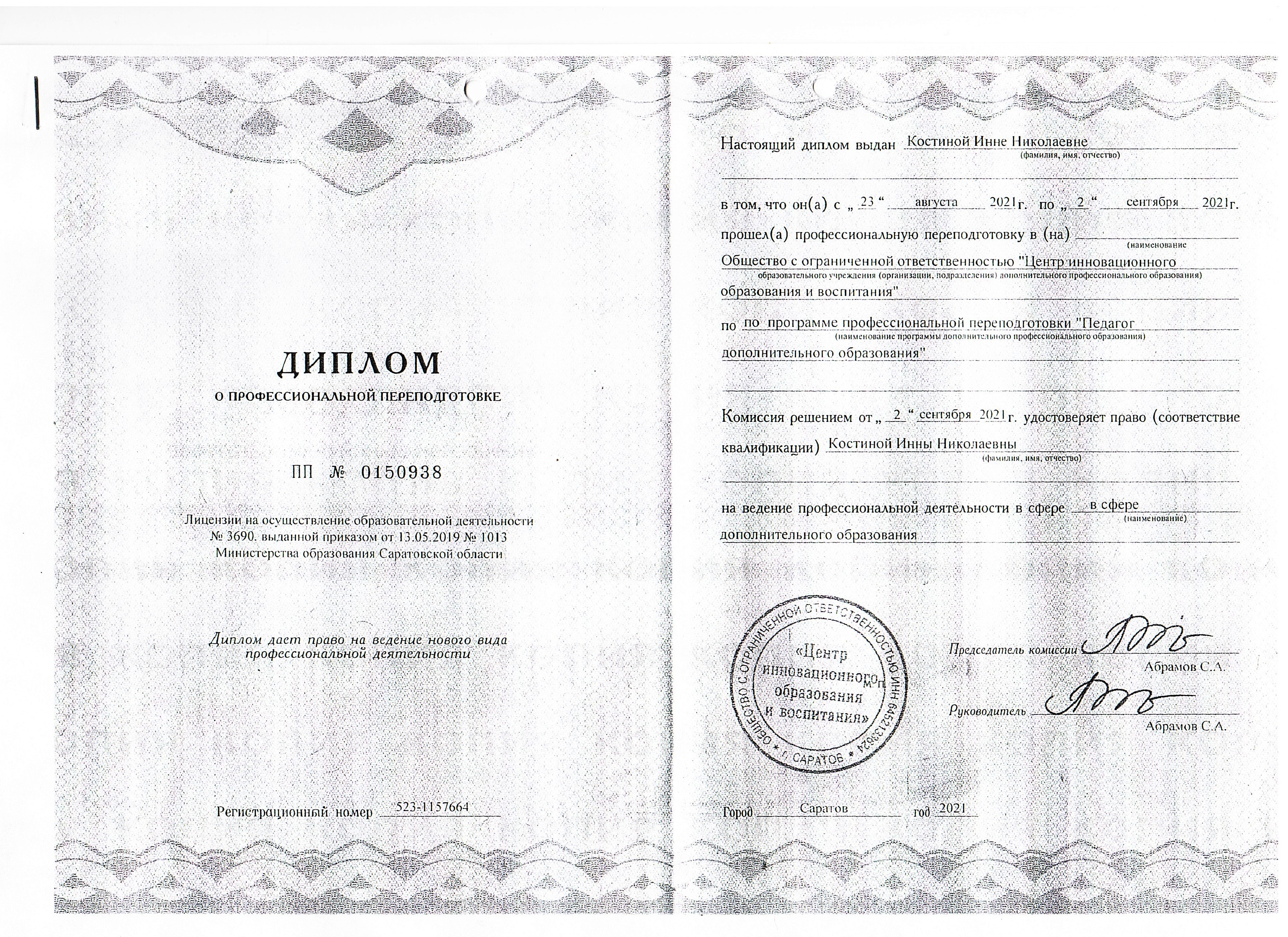 Образование по специальности: профессиональная переподготовка. Присвоена квалификация: педагог дополнительного образования. Документ о получении образования: скачать