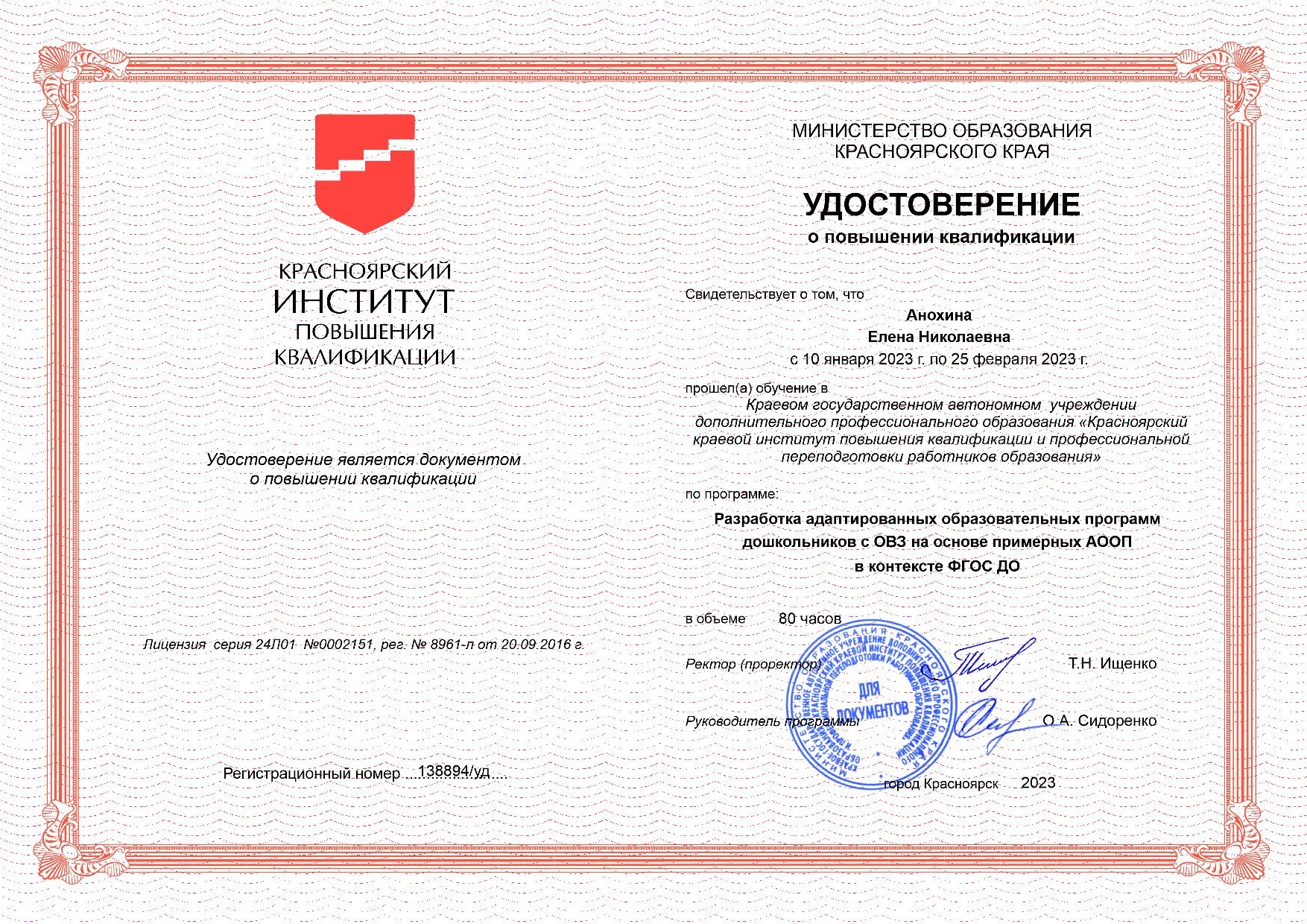 Обучение по курсу: «Разработка адаптированных образовательных программ дошкольников с ОВЗ на основе примерных АООП в контексте ФГОС ДО». Документ о повышении квалификации: скачать