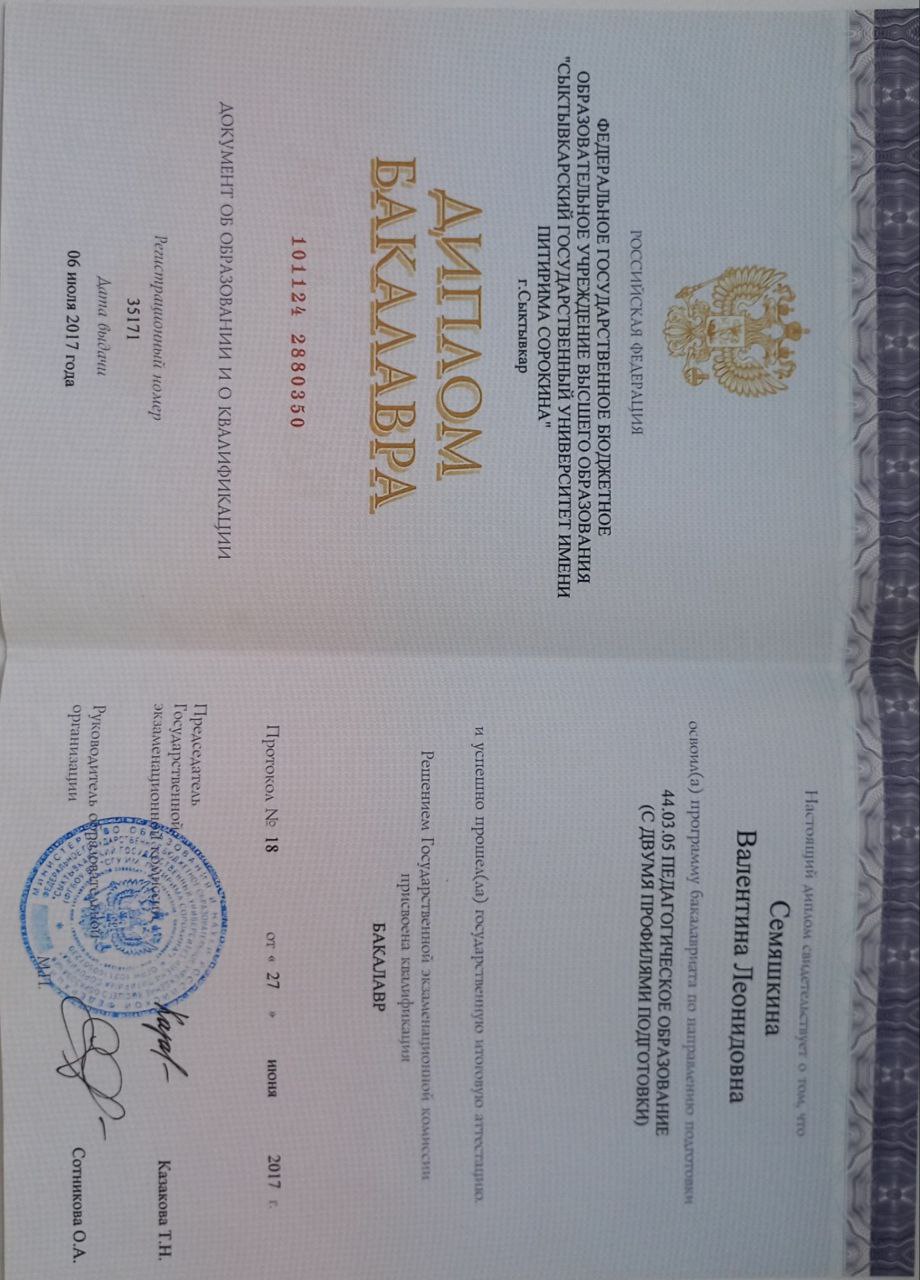 Образование по специальности: начальное образование, дошкольное образование. Присвоена квалификация: Педагогическое образование с двумя профилями подготовки. Документ о получении образования: скачать