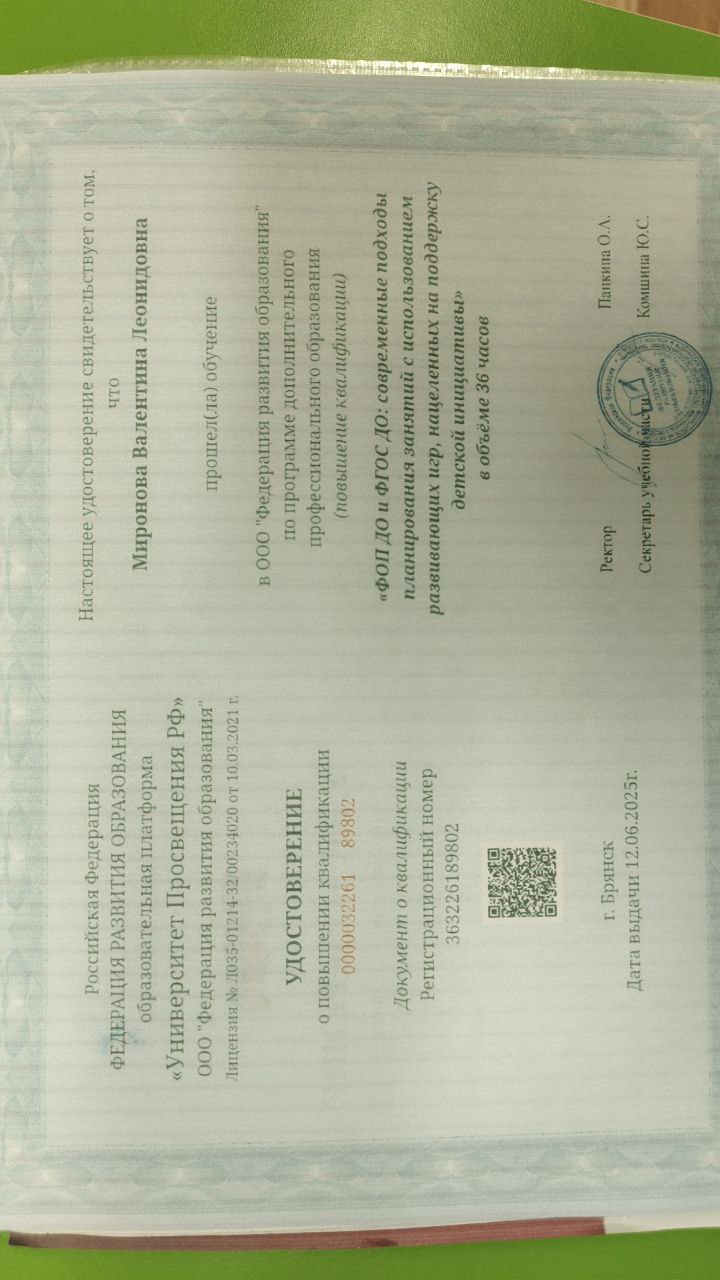 Обучение по курсу: ФОП ДО и ФГОС ДО: современные подходы планирования занятий с использованием развивающих игр, нацеленных на поддержку детской инициативы. Документ о повышении квалификации: скачать