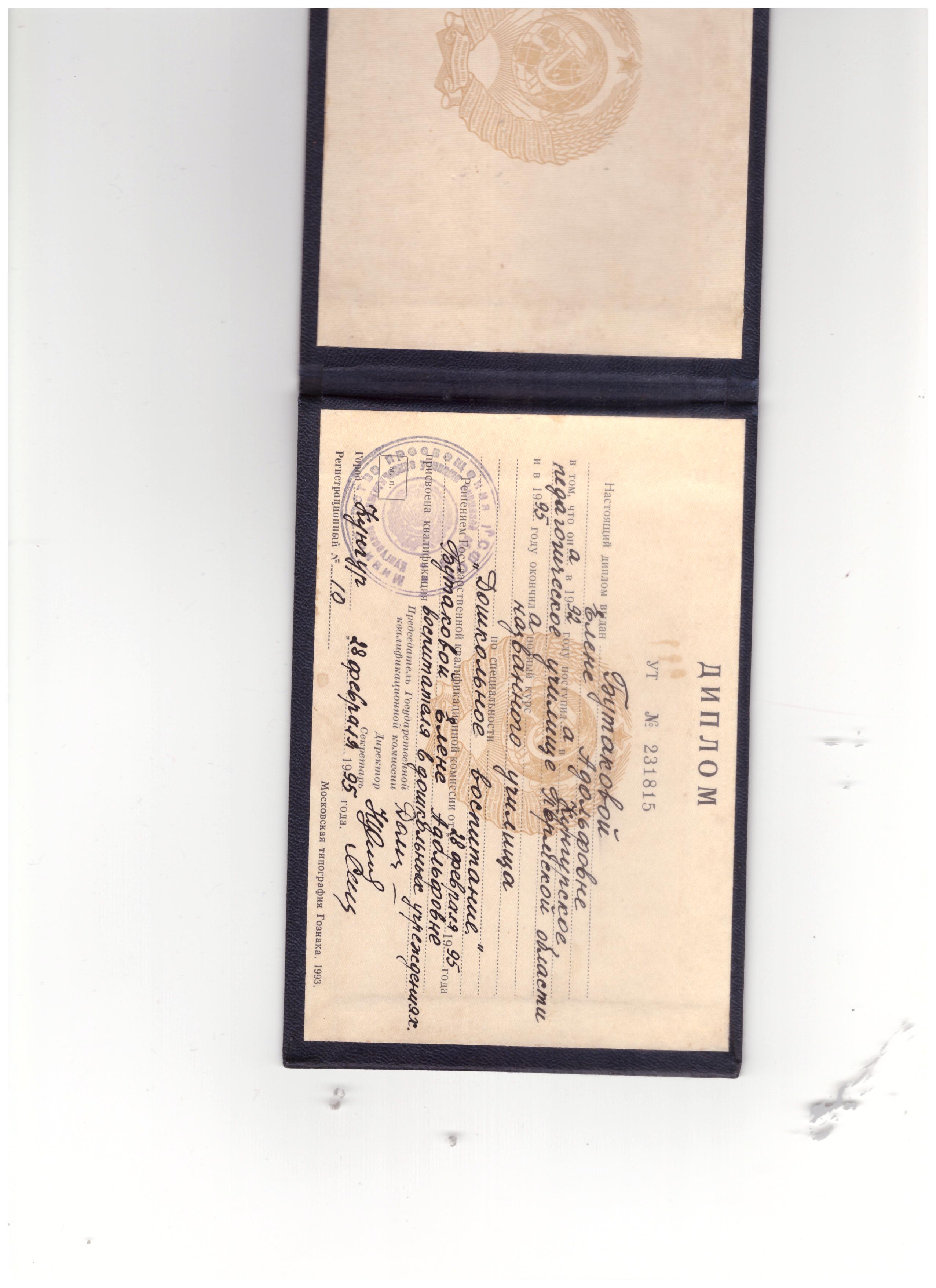 Образование по специальности: "Дошкольное воспитание". Присвоена квалификация: Воспитатель в дошкольных учреждениях. Документ о получении образования: скачать