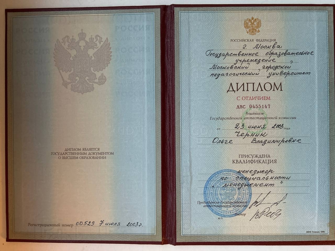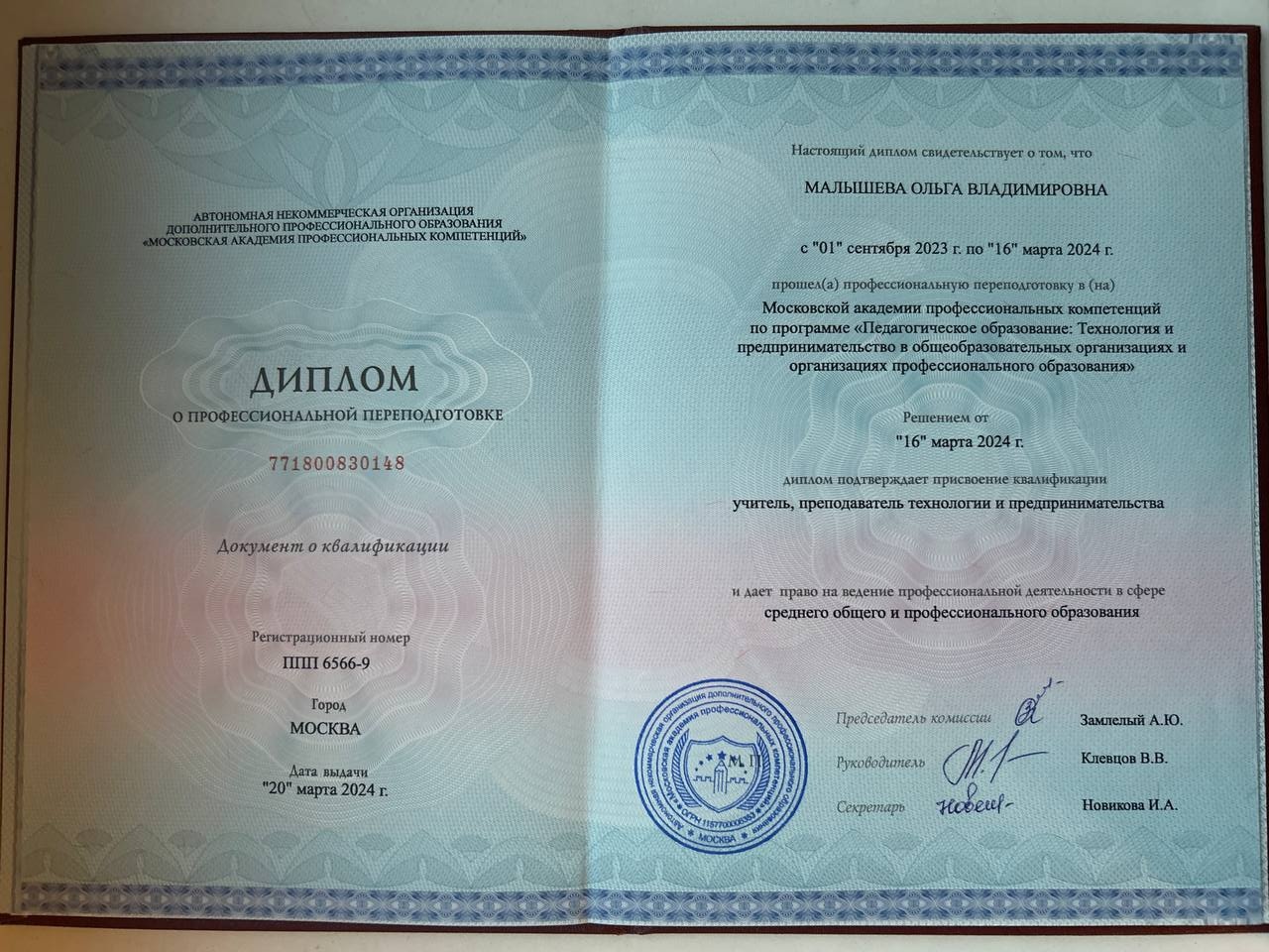 Образование по специальности: Менеджмент в образовании. Присвоена квалификация: Менеджмент. Документ о получении образования: скачать