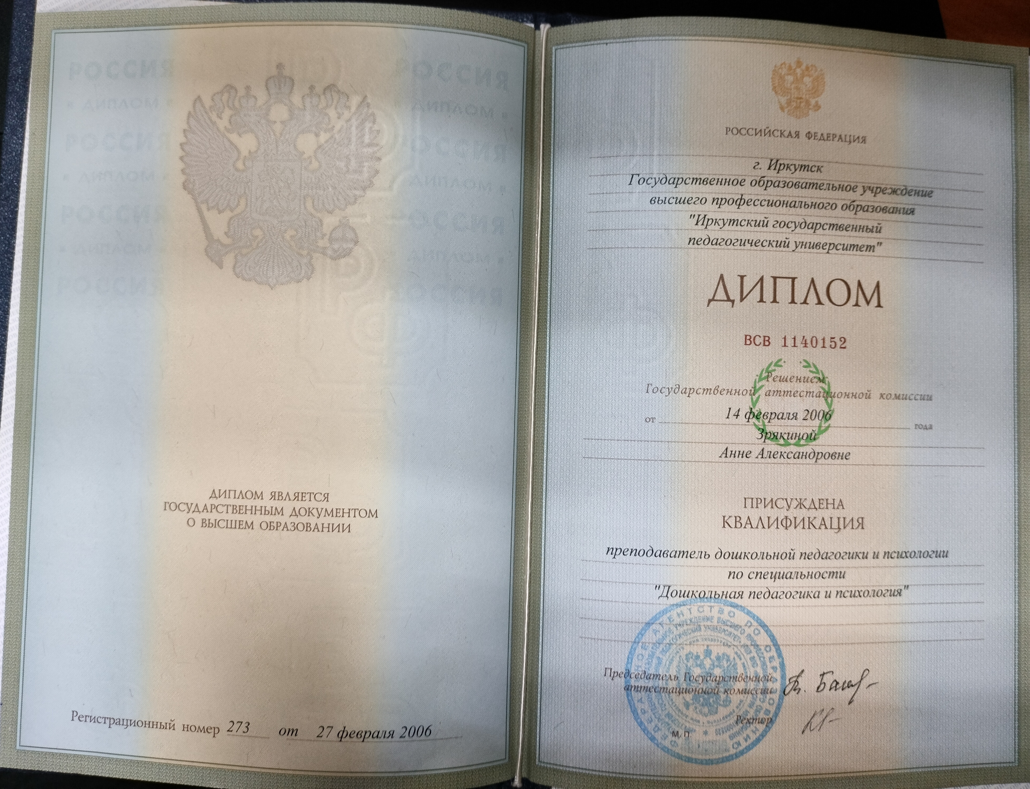Образование по специальности: Дошкольная педагогика и психология. Присвоена квалификация: Преподаватель дошкольной педагогики и психологии. Документ о получении образования: скачать