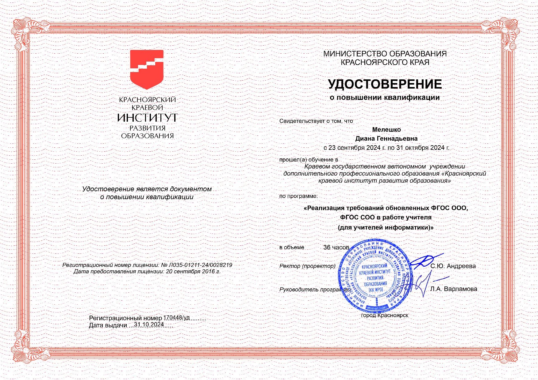 Обучение по курсу: Реализация требований обновленных ФГОС ООО, ФГОС СОО в работе учителя(для учителей информатики). Документ о повышении квалификации: скачать