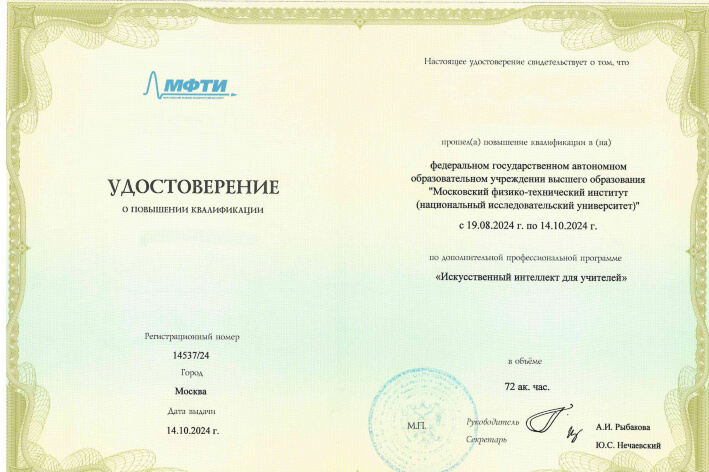 Обучение по курсу: Искусственный интеллект для учителей. Документ о повышении квалификации: скачать