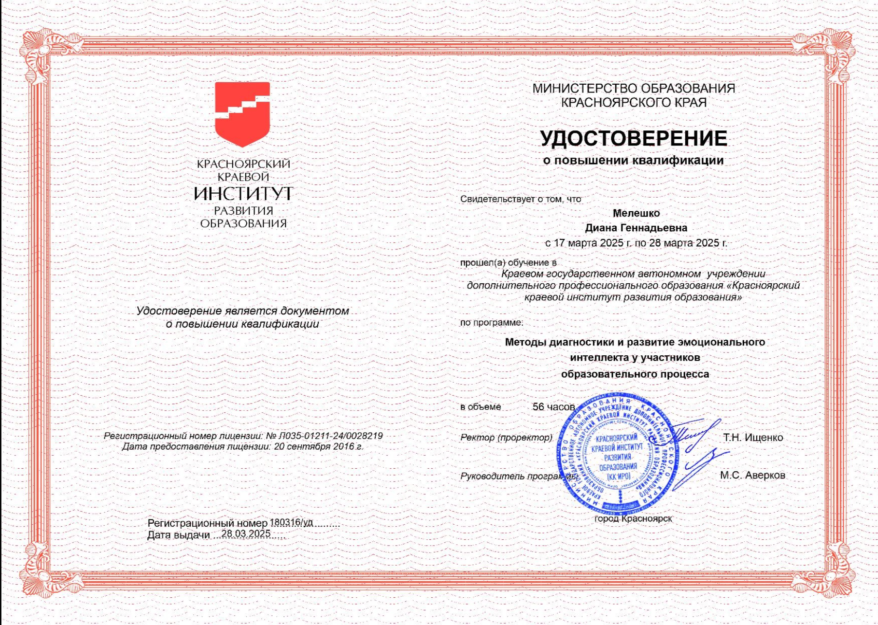 Обучение по курсу: Методы диагностики и развитие эмоционального интеллекта у участников образовательного процесса. Документ о повышении квалификации: скачать