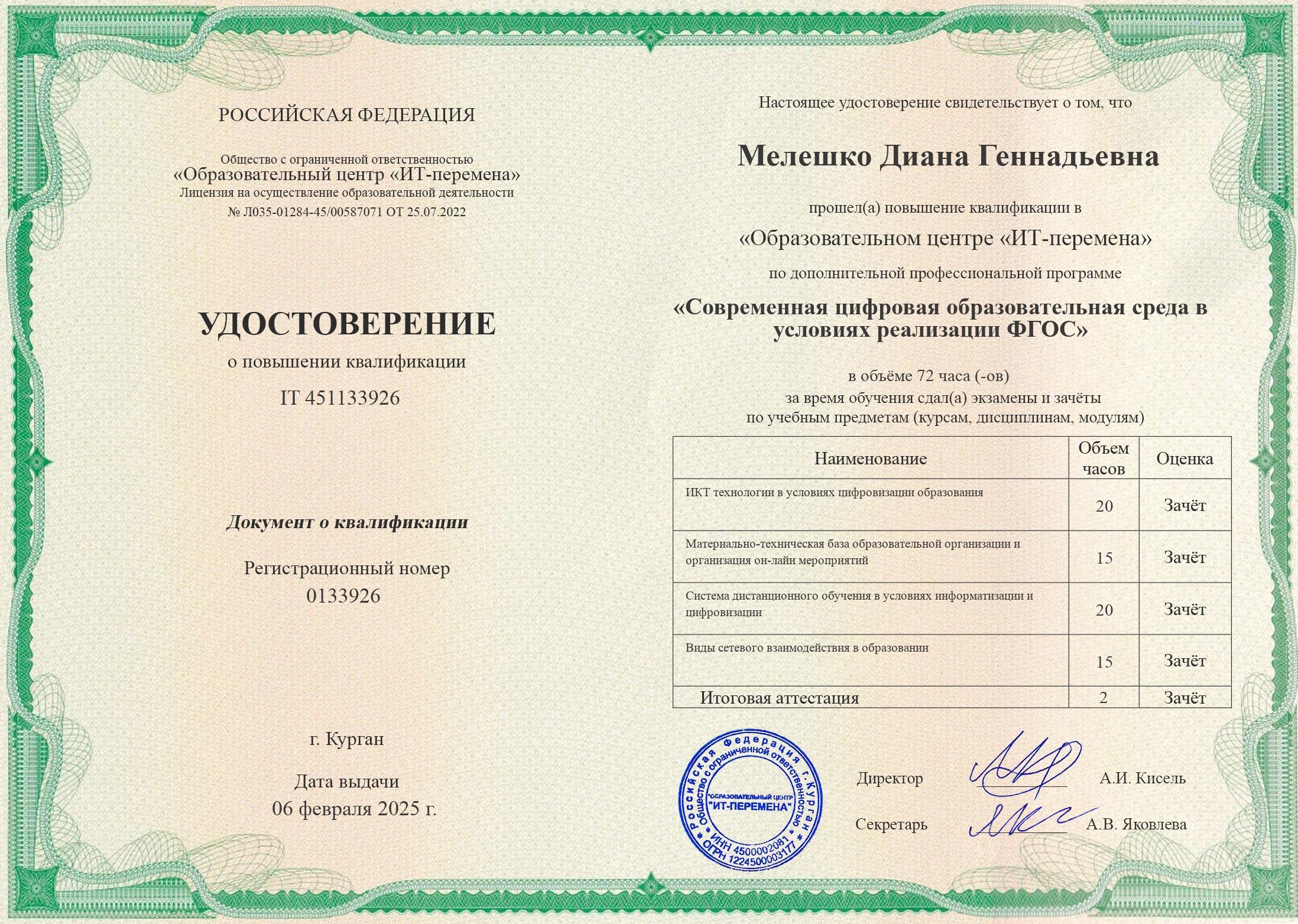 Обучение по курсу: Современная цифровая образовательная среда в условиях реализации ФГОС. Документ о повышении квалификации: скачать