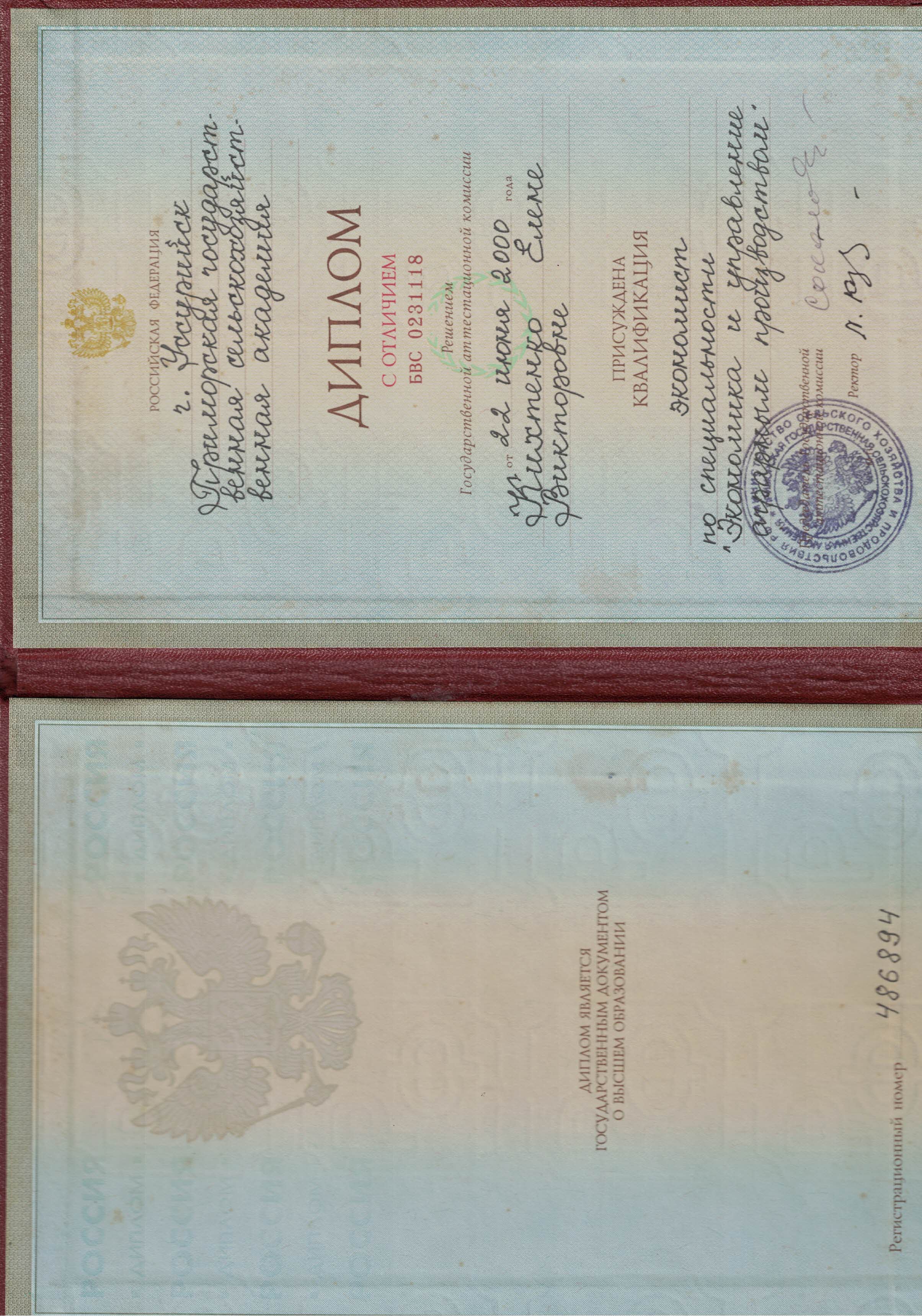 Образование по специальности: Экономика и управление аграрным производством. Присвоена квалификация: экономист. Документ о получении образования: скачать