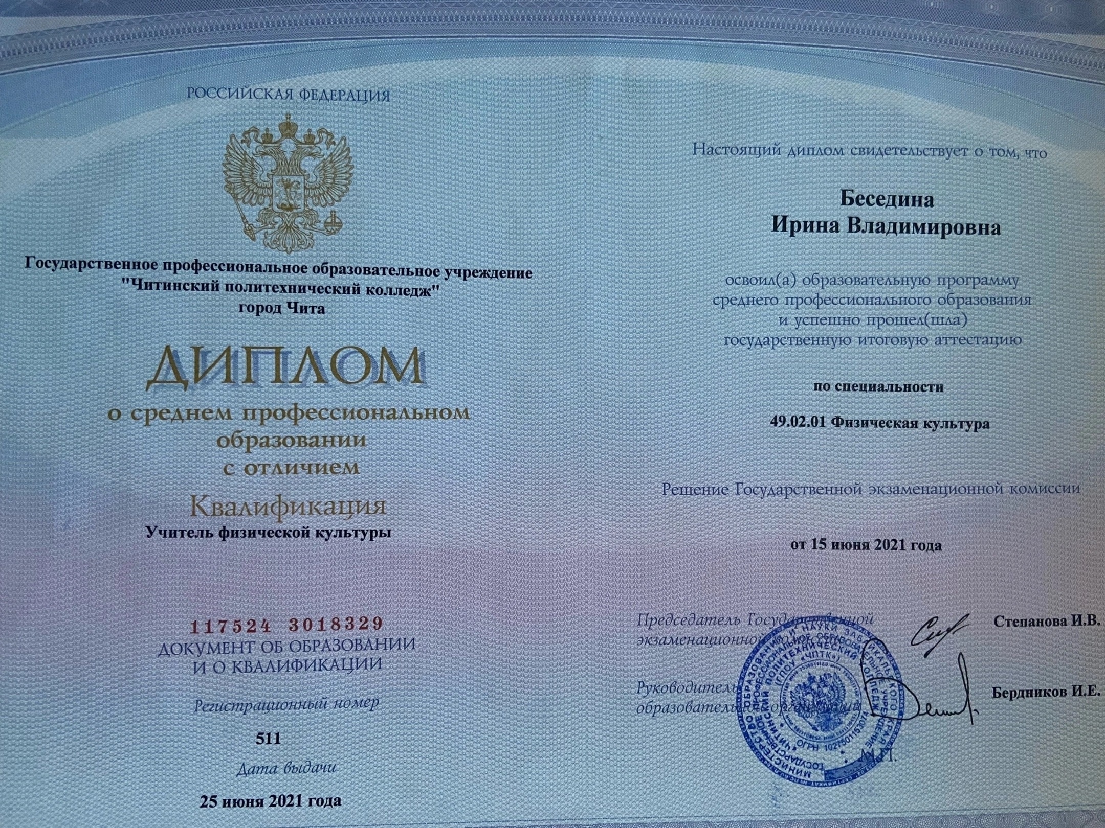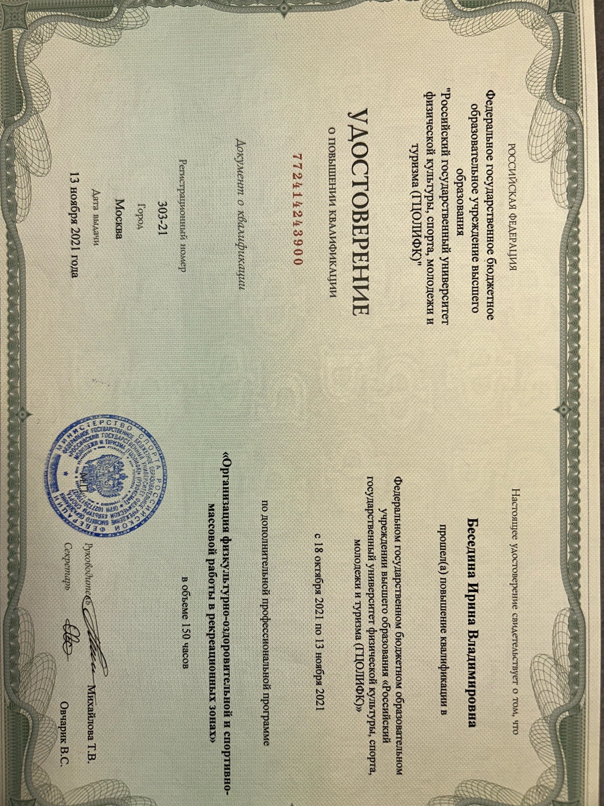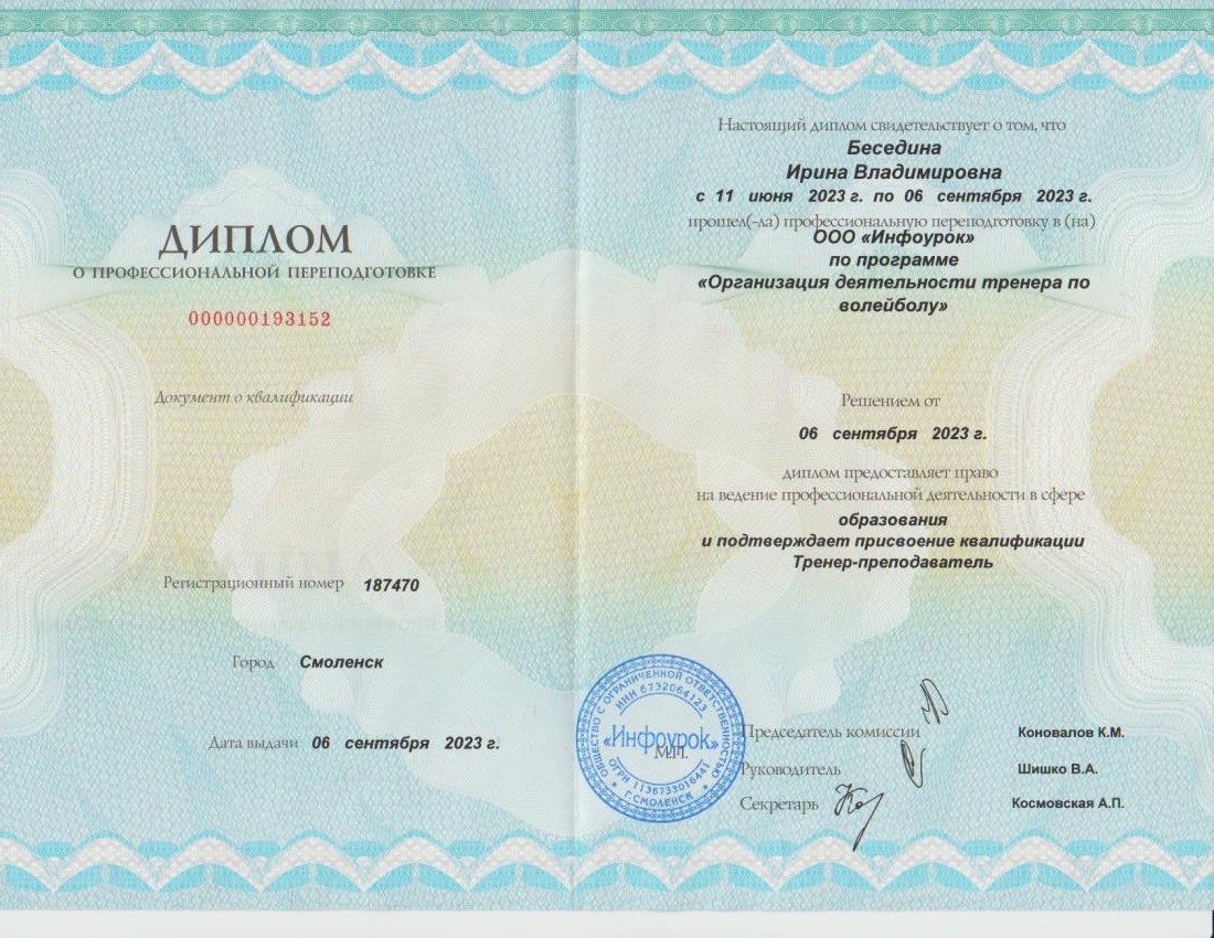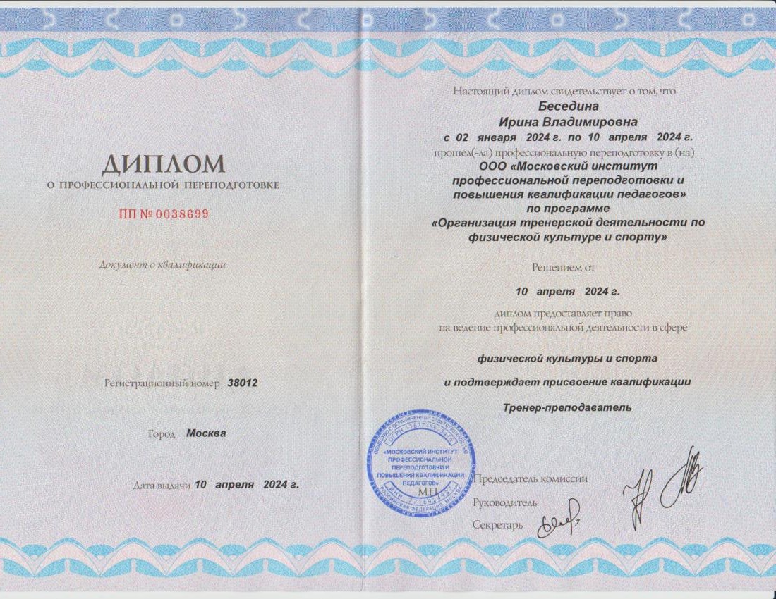 Образование по специальности: Физическая культура. Присвоена квалификация: Учитель физической культуры. Документ о получении образования: скачать