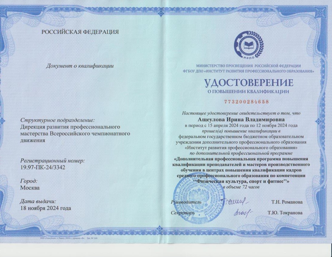 Обучение по курсу: Дополнительная профессиональная программа повышения квалификации преподавателей и мастеров производственного обучения в центрах повышения квалификации кадров среднего профессионального образования по компетенции "Физическая культура, спорт и фитнес". Документ о повышении квалификации: скачать