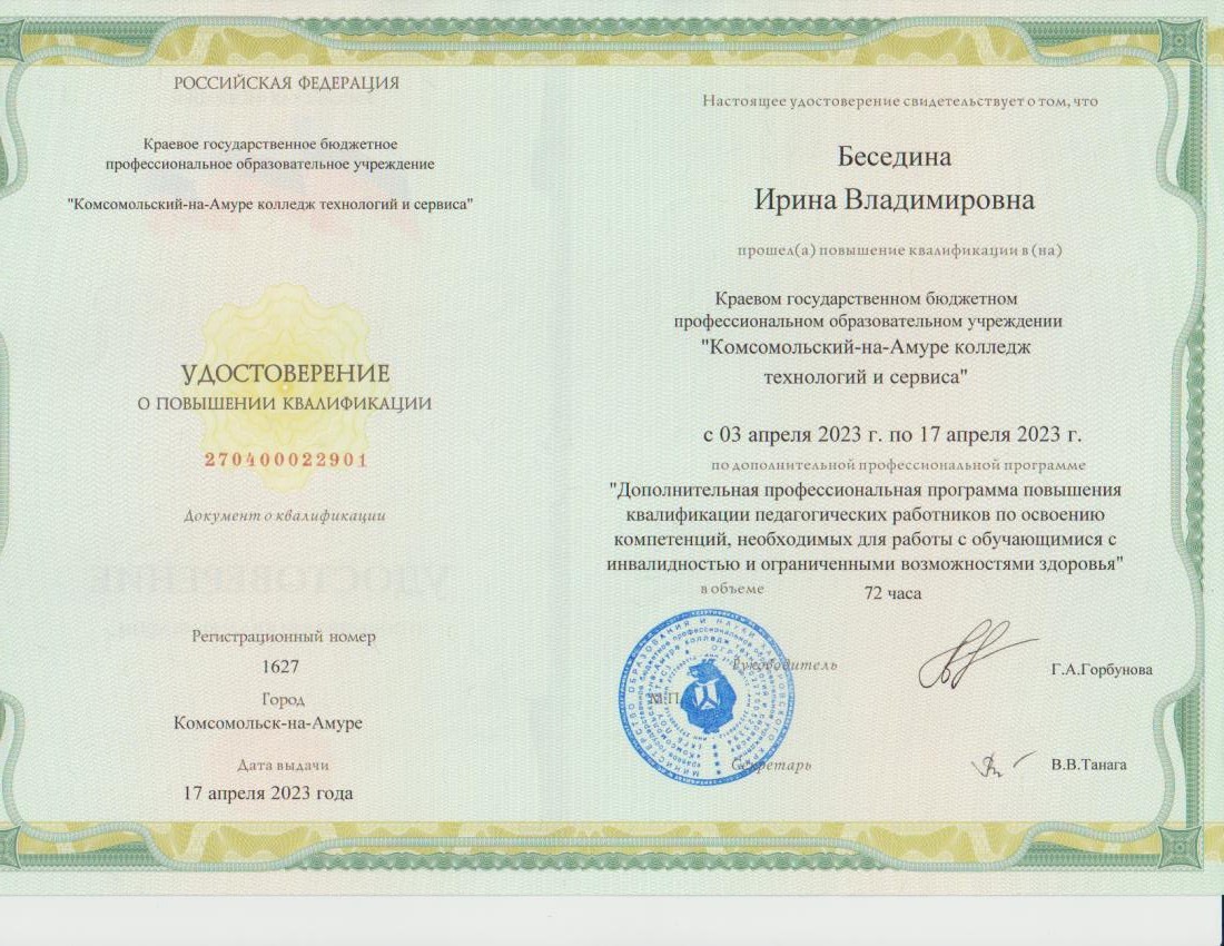 Обучение по курсу: "Дополнительная профессиональная программа повышения квалификации педагогических работников по освоению компетенций, необходимых для работы с обучающимися с инвалидностью и ограниченными возможностями здоровья". Документ о повышении квалификации: скачать