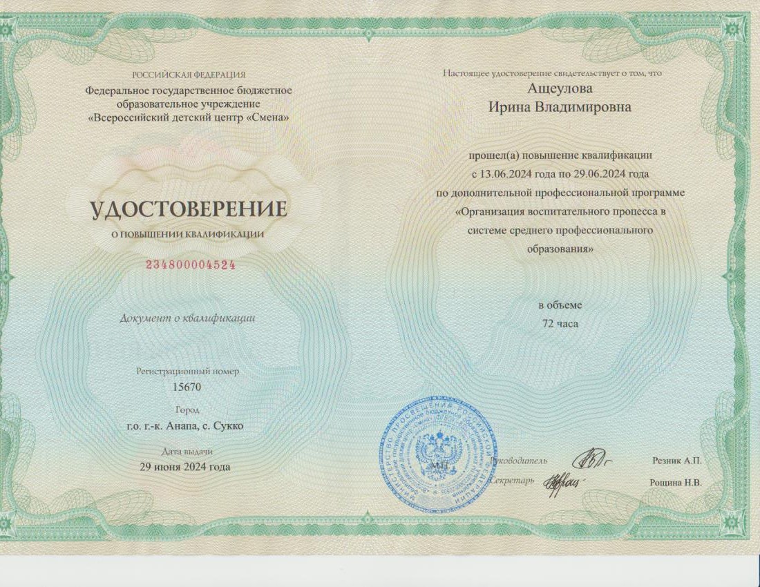Обучение по курсу: Организация воспитательного процесса в системе среднего профессионального образования". Документ о повышении квалификации: скачать