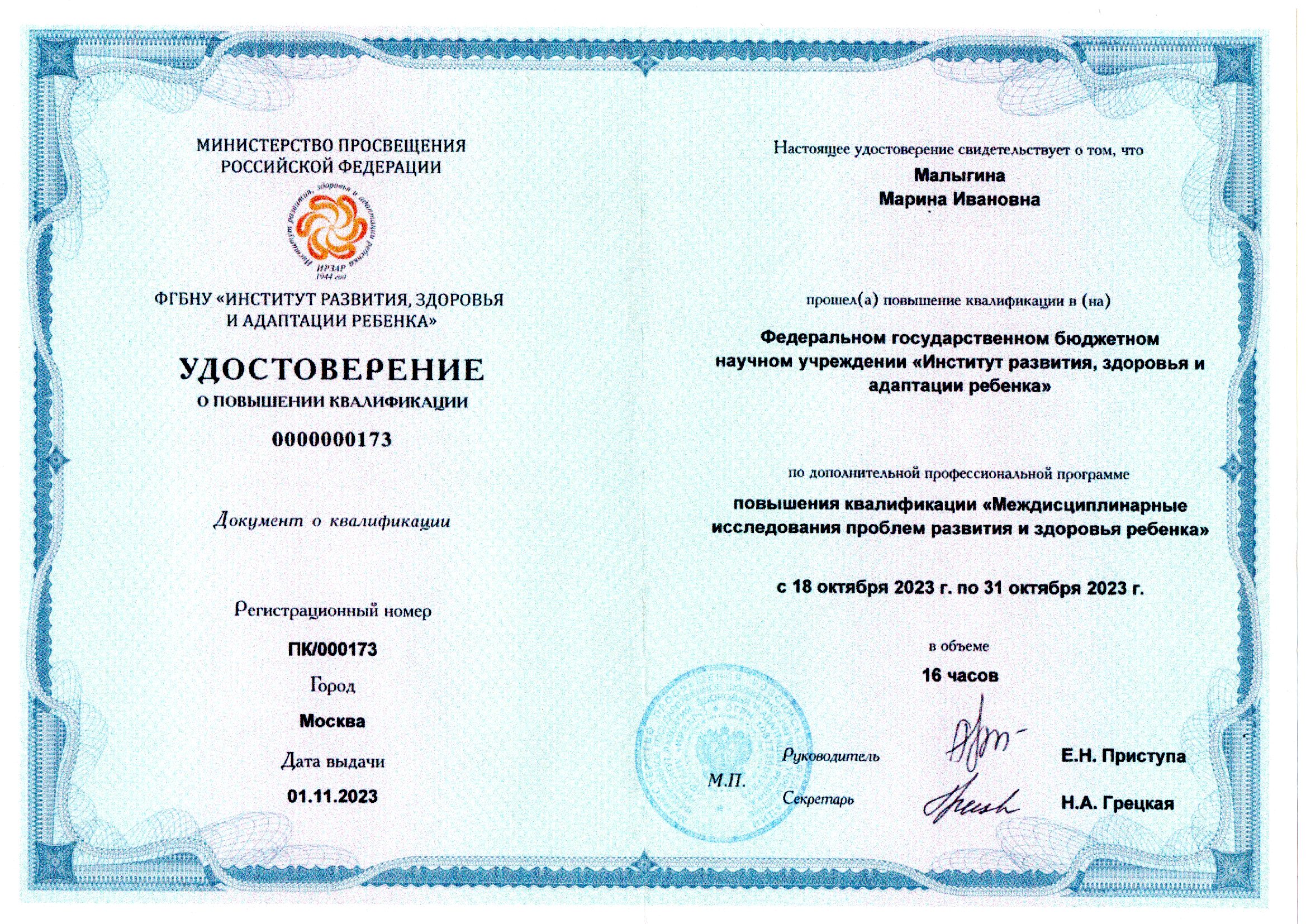Образование по специальности: дополнительная профессиональная программа. Присвоена квалификация: ПК "Междисциплинарные исследования проблем развития и здоровья ребёнка". Документ о получении образования: скачать