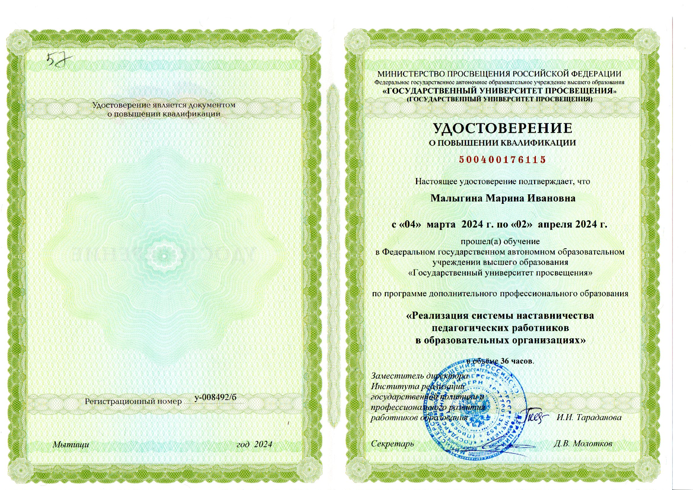 Образование по специальности: по программе дополнительного профессионального образования. Присвоена квалификация: "Реализация системы наставничества педагогических работников в образовательных организациях". Документ о получении образования: скачать