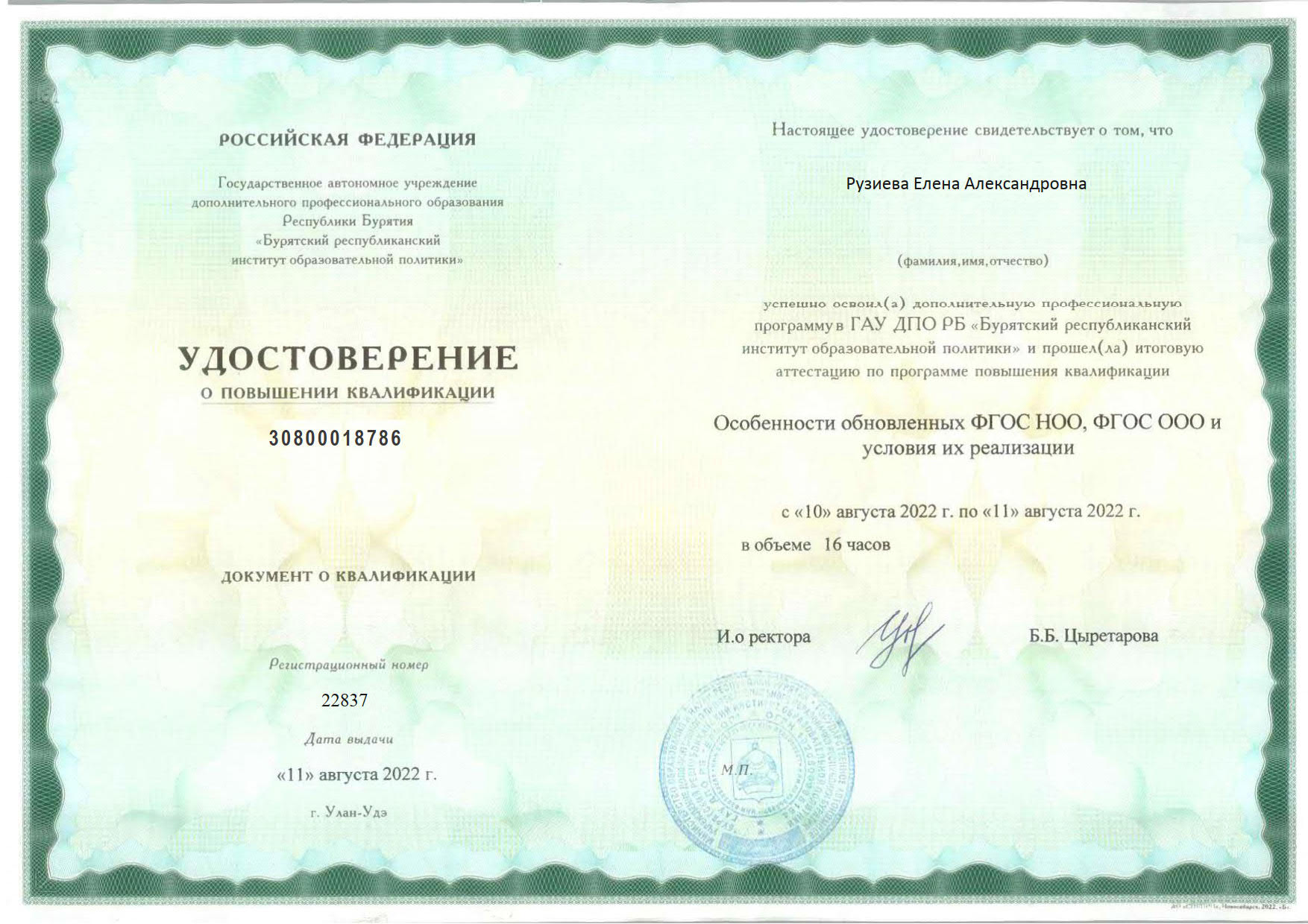 Обучение по курсу: « Особенности обновленных ФГОС НОО, ФГОС ООО и условия их реализации». Документ о повышении квалификации: скачать