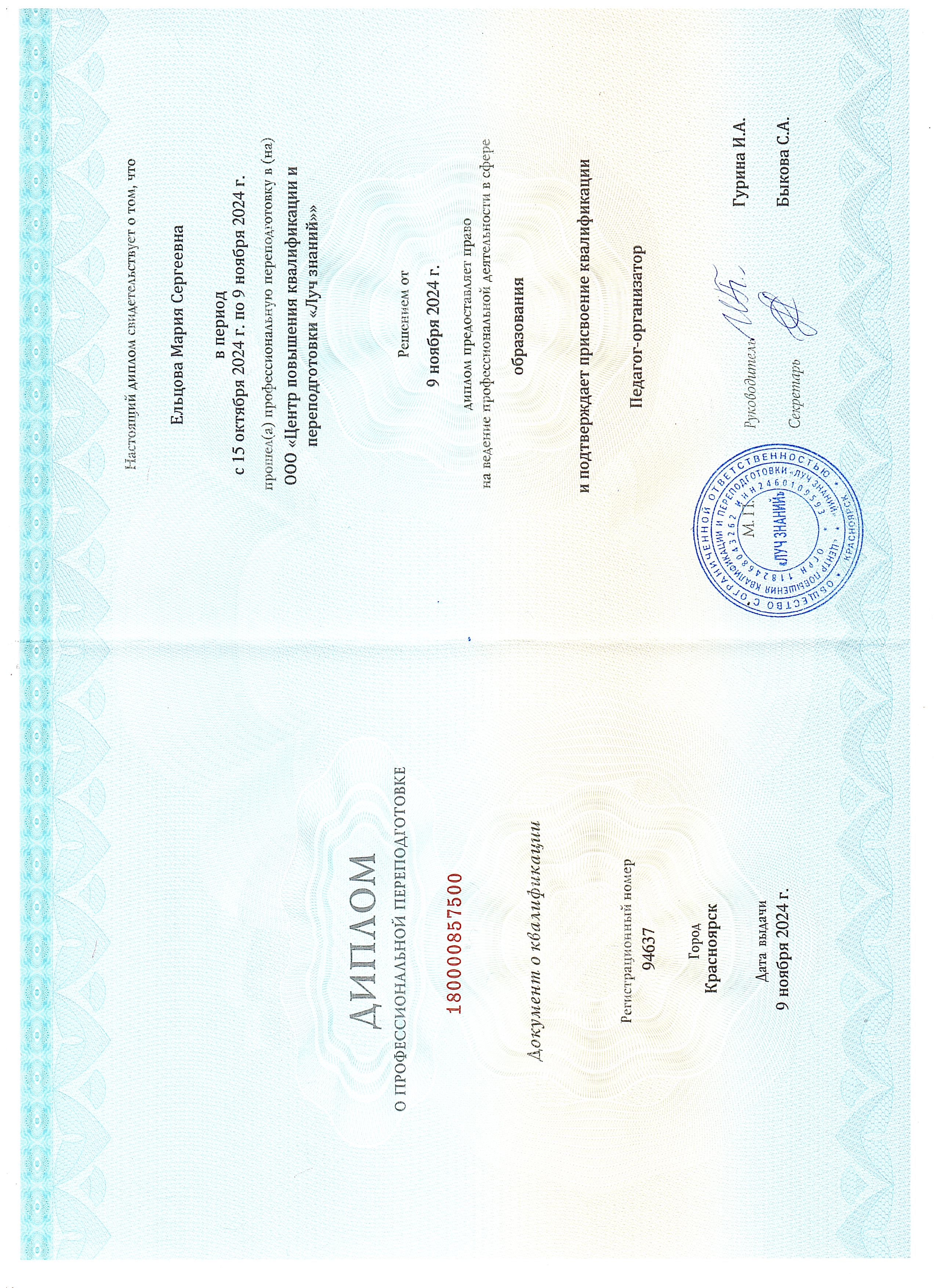 Образование по специальности: Педагог. Присвоена квалификация: Педагог-организатор. Документ о получении образования: скачать