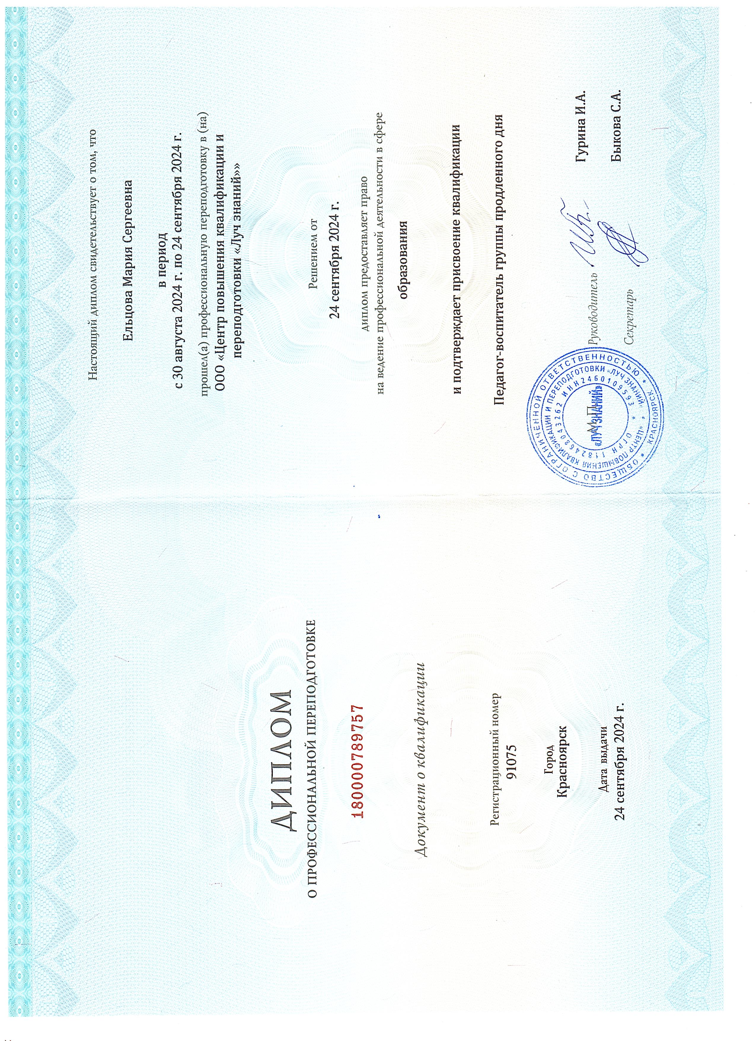 Образование по специальности: Педагог. Присвоена квалификация: Педагог-воспитатель группы продленного дня. Документ о получении образования: скачать