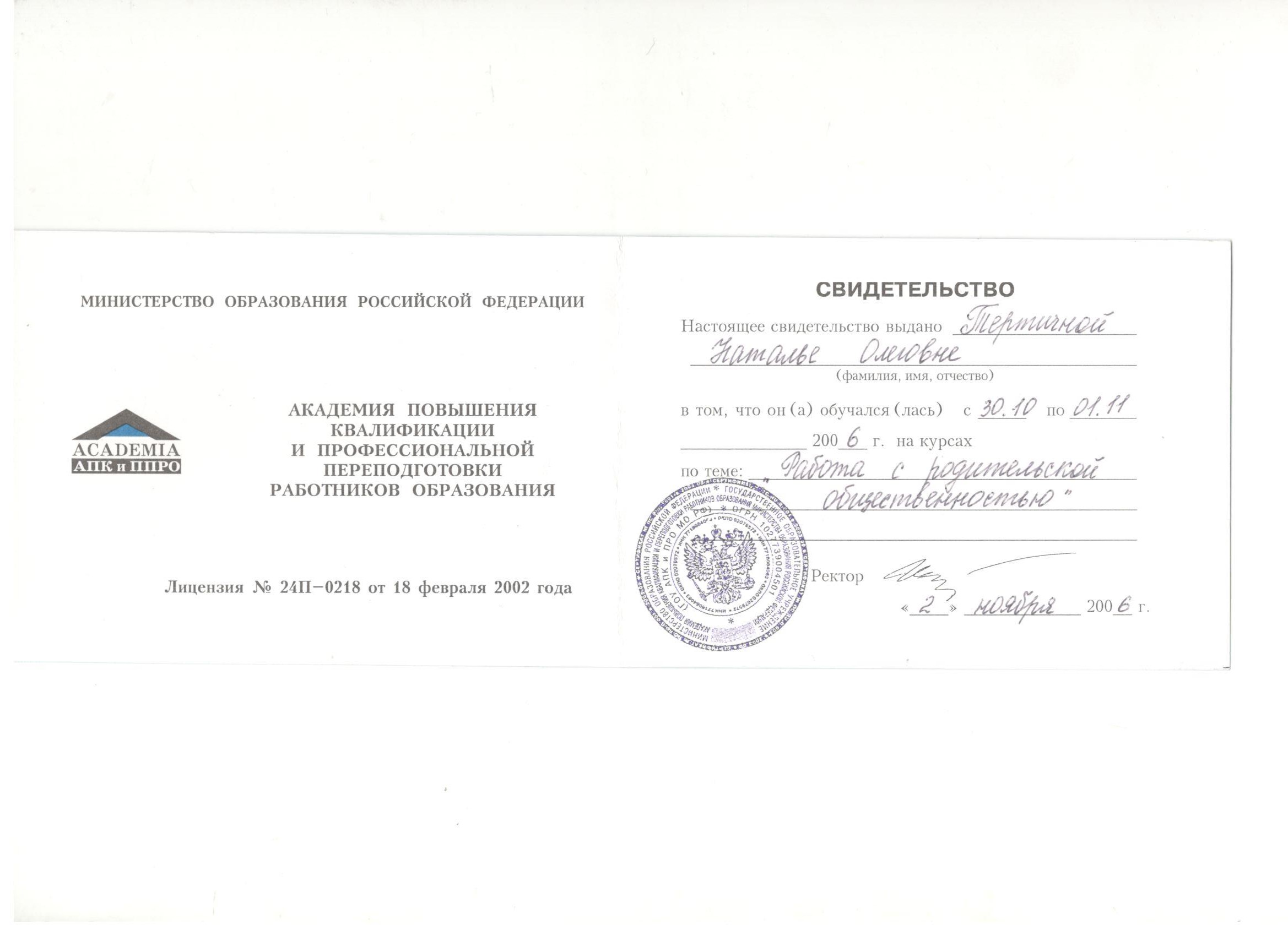 Обучение по курсу: Работа с родительской общественностью. Документ о повышении квалификации: скачать