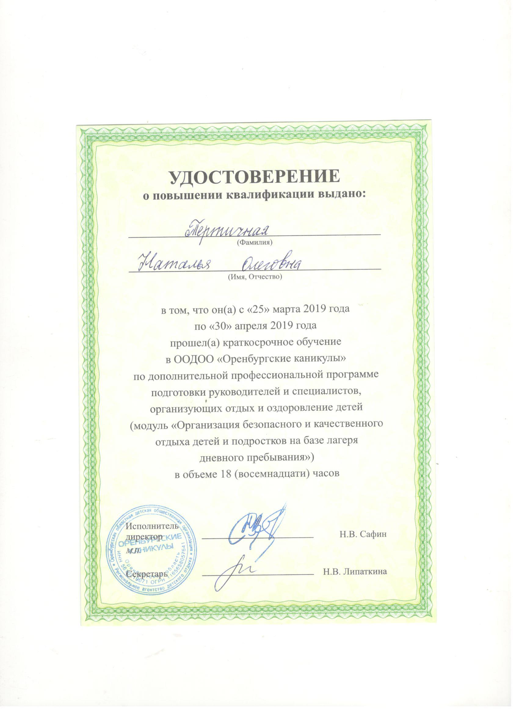 Обучение по курсу: "Организация безопасного и качественного отдыха детей и подростков на базе лагеря дневного пребывания". Документ о повышении квалификации: скачать