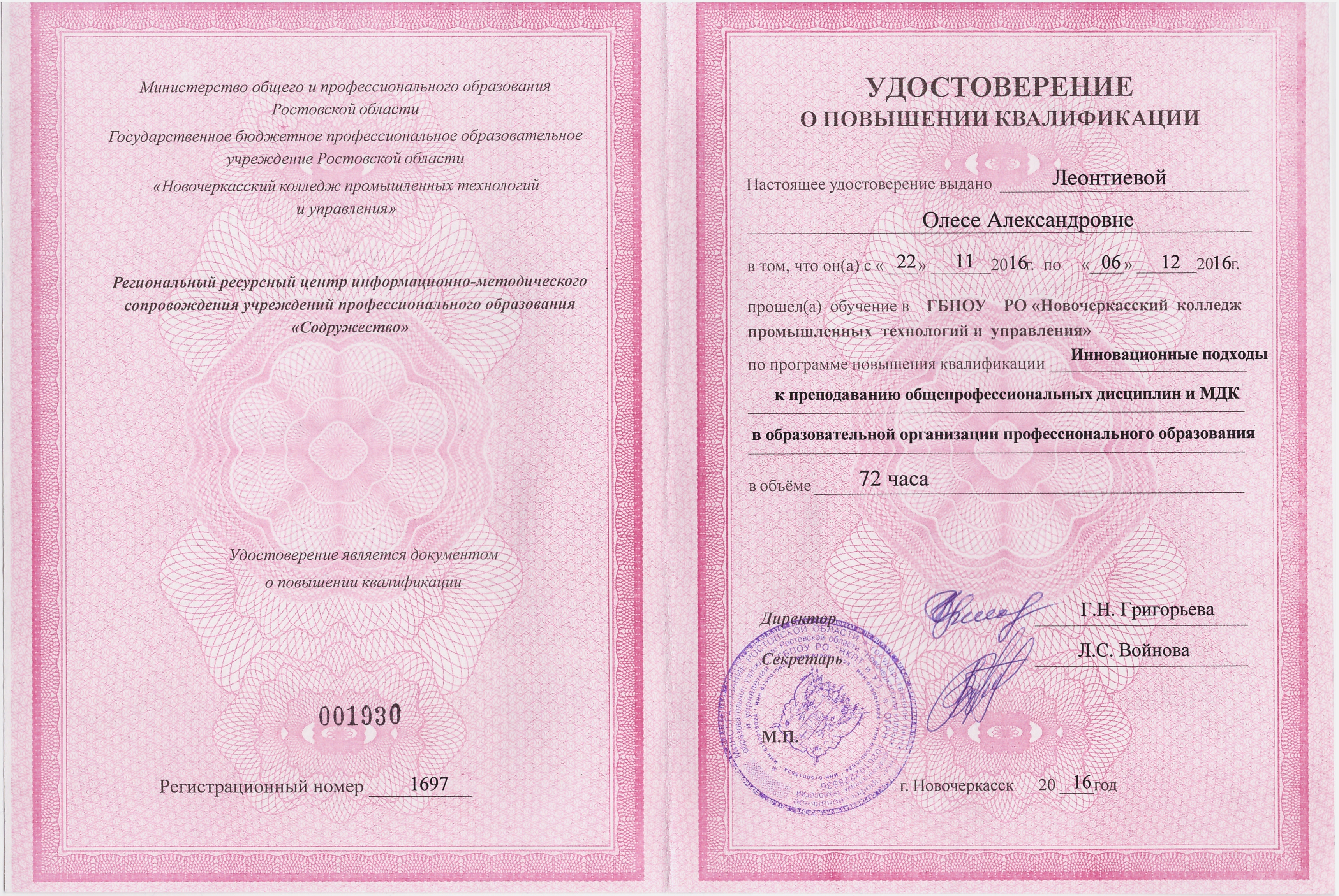 Обучение по курсу: Инновационные подходы к преподаванию общепрофессиональных дисциплин и МДК в образовательной организации профессионального образования. Документ о повышении квалификации: скачать