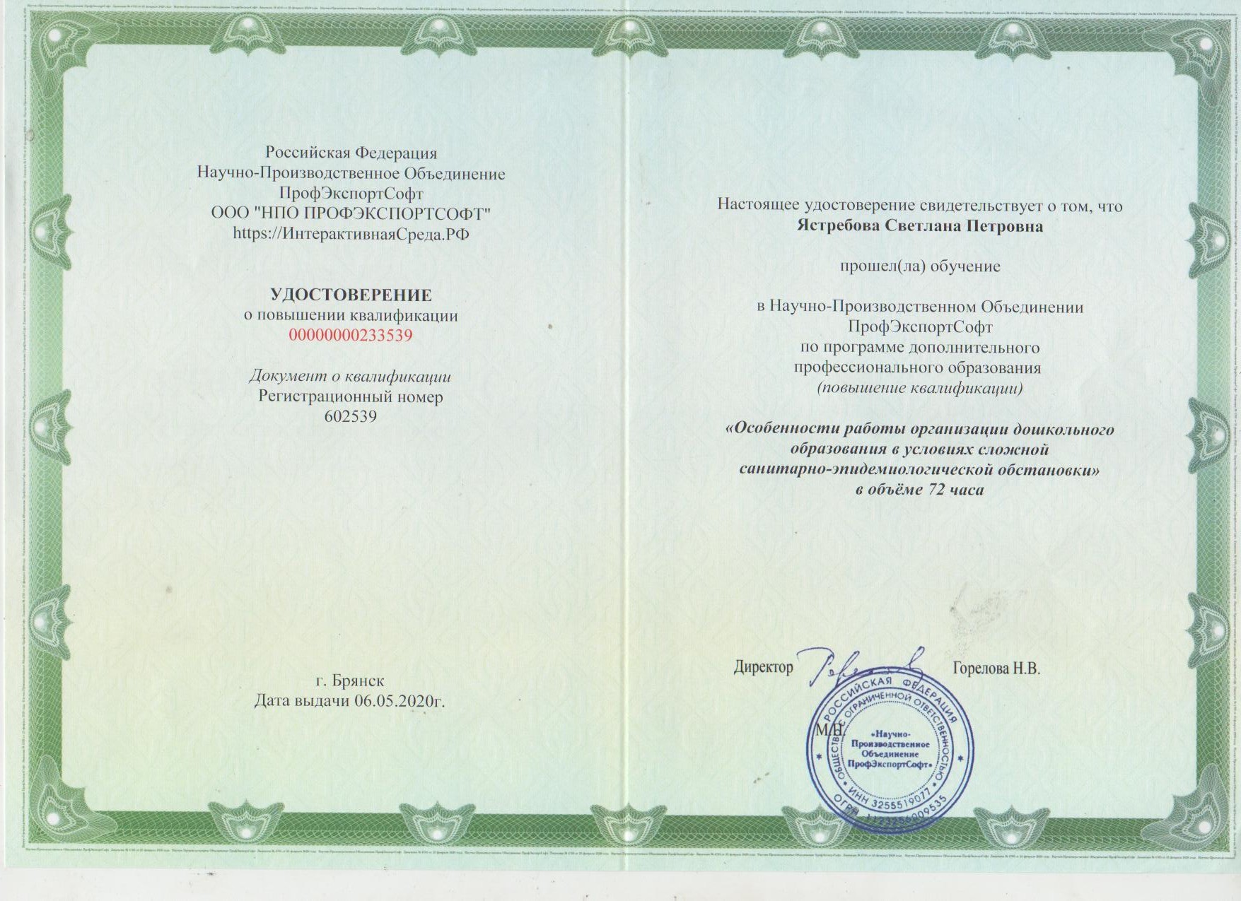 Обучение по курсу: «Особенности работы организации дошкольного образования в условиях сложной санитарно - эпидемиологической обстановки». Документ о повышении квалификации: скачать