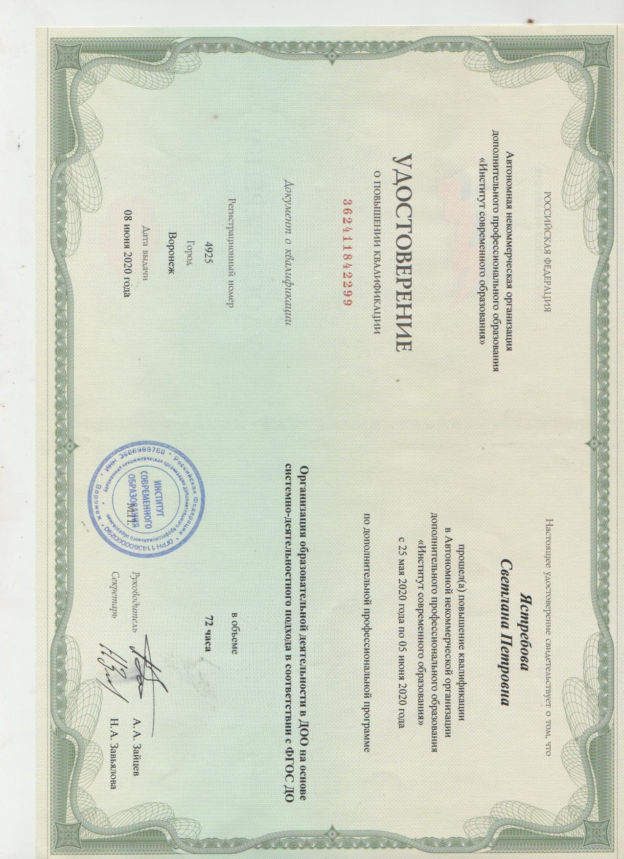 Обучение по курсу: «Организация образовательной деятельности в ДОО на основе системно-деятельностного подхода в соответствии с ФГОС ДО». Документ о повышении квалификации: скачать