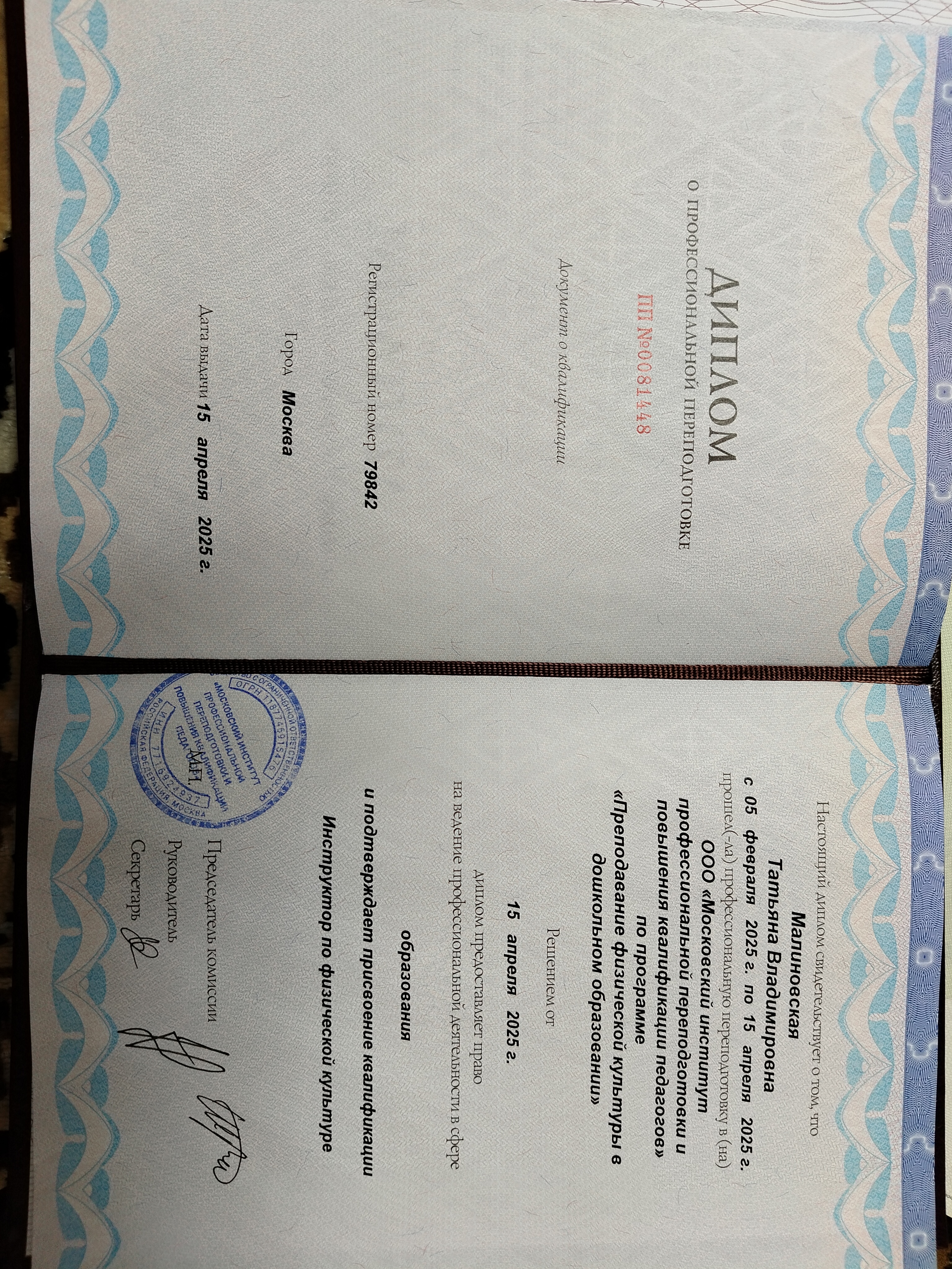 Образование по специальности: Преподавание физической культуры в дошкольном образовании. Присвоена квалификация: Инструктор по физической культуре. Документ о получении образования: скачать