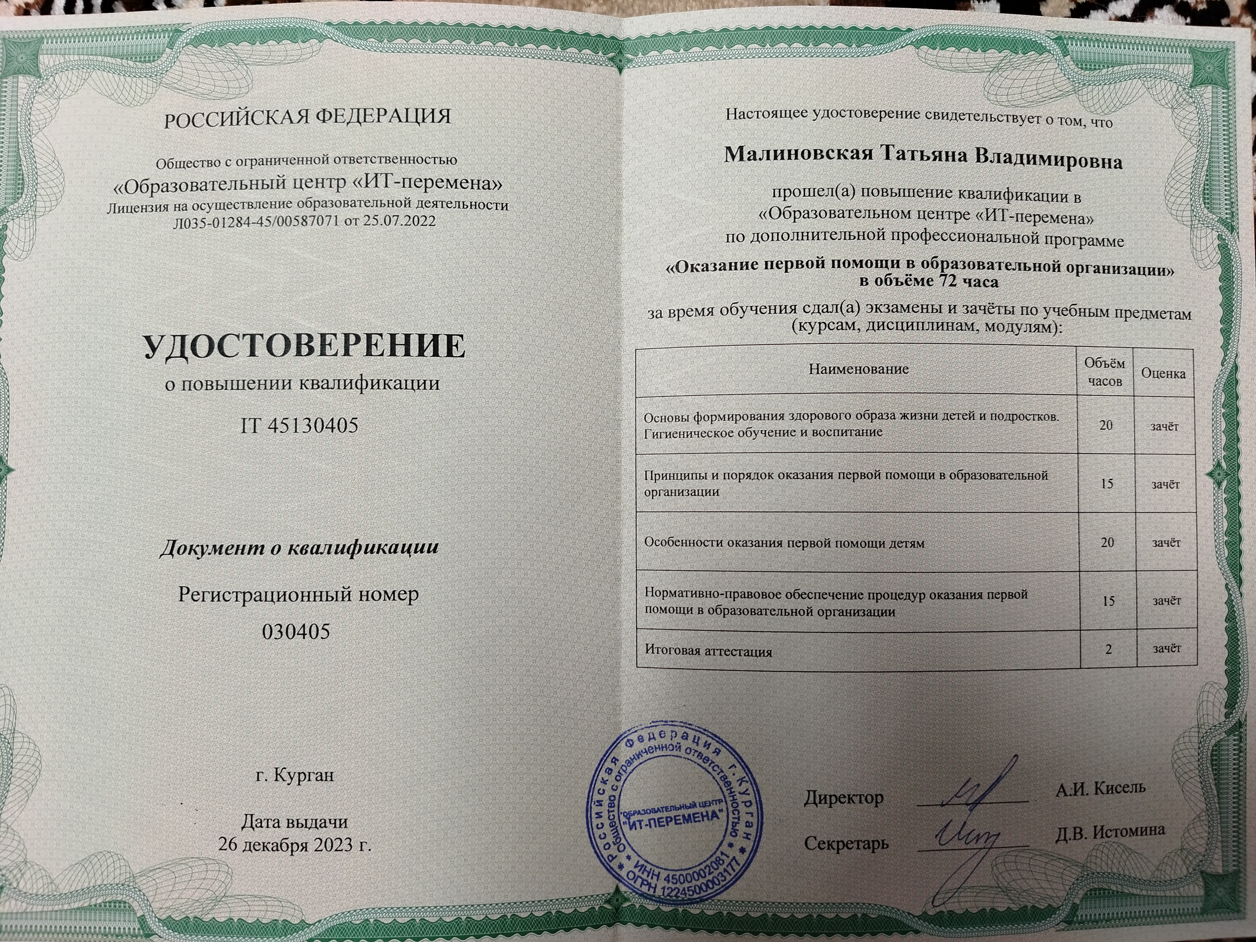 Обучение по курсу: Оказание первой помощи в образовательной организации". Документ о повышении квалификации: скачать