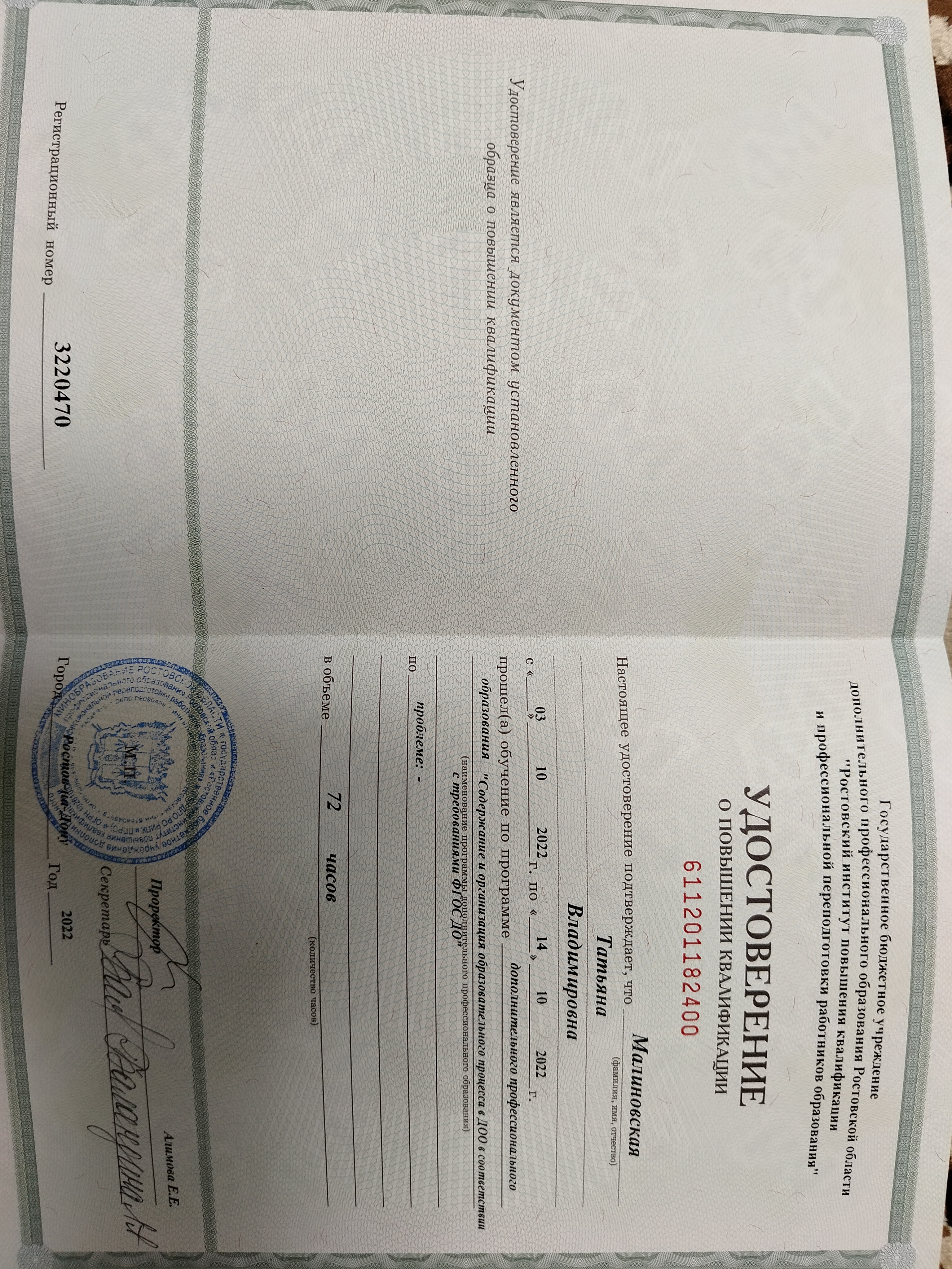 Образование по специальности: Работа м логопедической группой дошкольного возраста. Присвоена квалификация: Воспитатель логопедической группы. Документ о получении образования: скачать